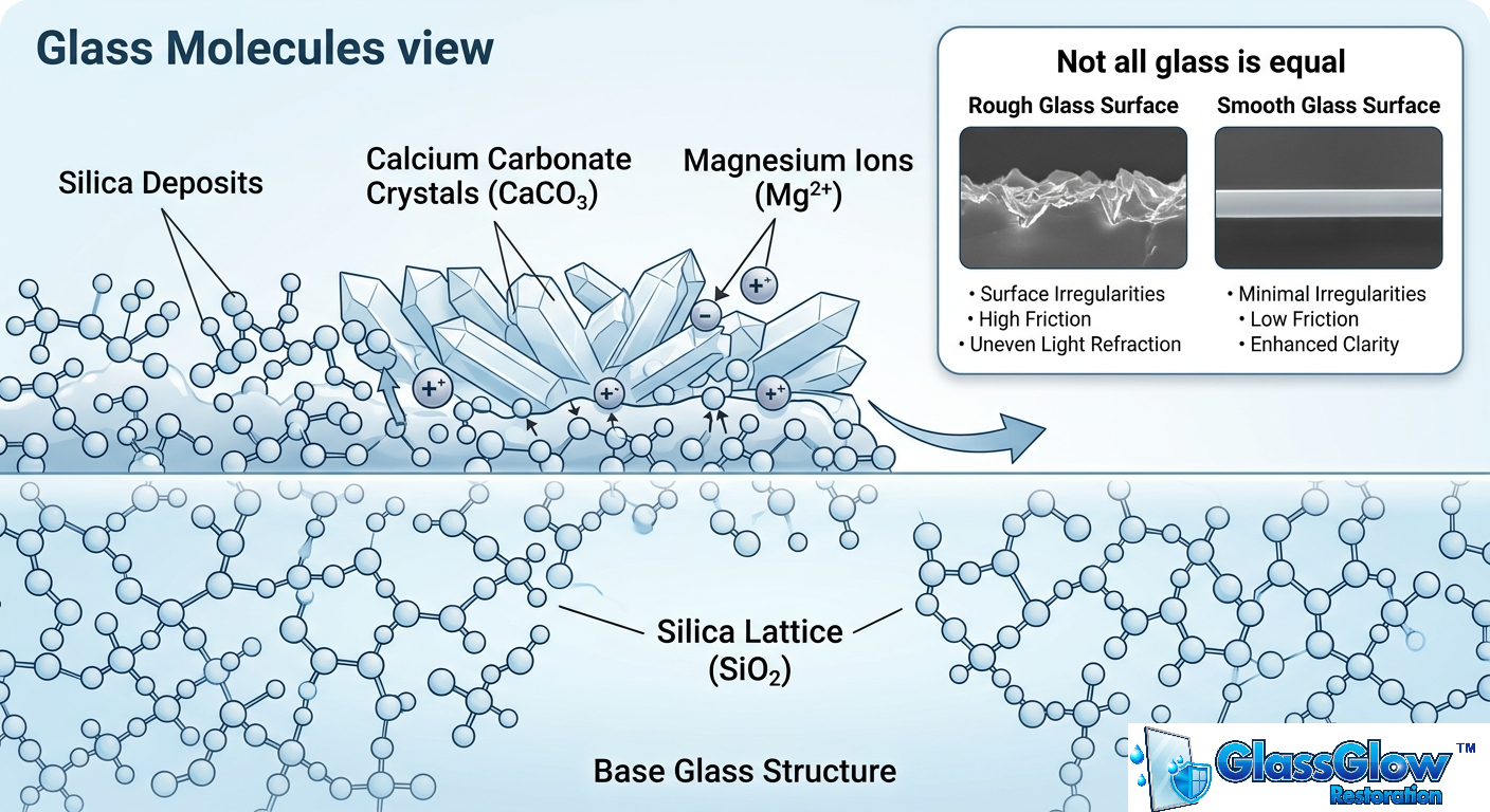 Understanding what you’re actually fighting is the first step to fixing it properly. Simple household cleaners can’t break these bonds effectively. That’s why GlassGlow Restoration™ uses a professional glass formulated mineral remover followed by precision high grade polishing compounds sourced from Italy and America — the same compounds used in glass factories — to restore the surface safely.