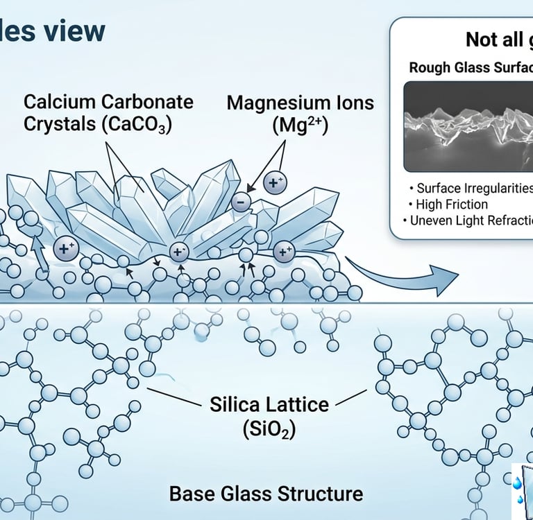 The main player is calcium carbonate — the same stuff that makes up limestone and chalk. In hard water it starts out dissolved (as calcium bicarbonate). When the water evaporates on your hot shower glass, a simple chemical reaction occurs: Ca(HCO₃)₂ → CaCO₃ + CO₂ + H₂O